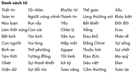 Điền từ thích hợp nhất vào chỗ trống. Lưu ý rằng mỗi từ chỉ có thể được sử dụng một lần và có nhiều từ trong trong danh sách hơn là những khoảng trống để điền vào.